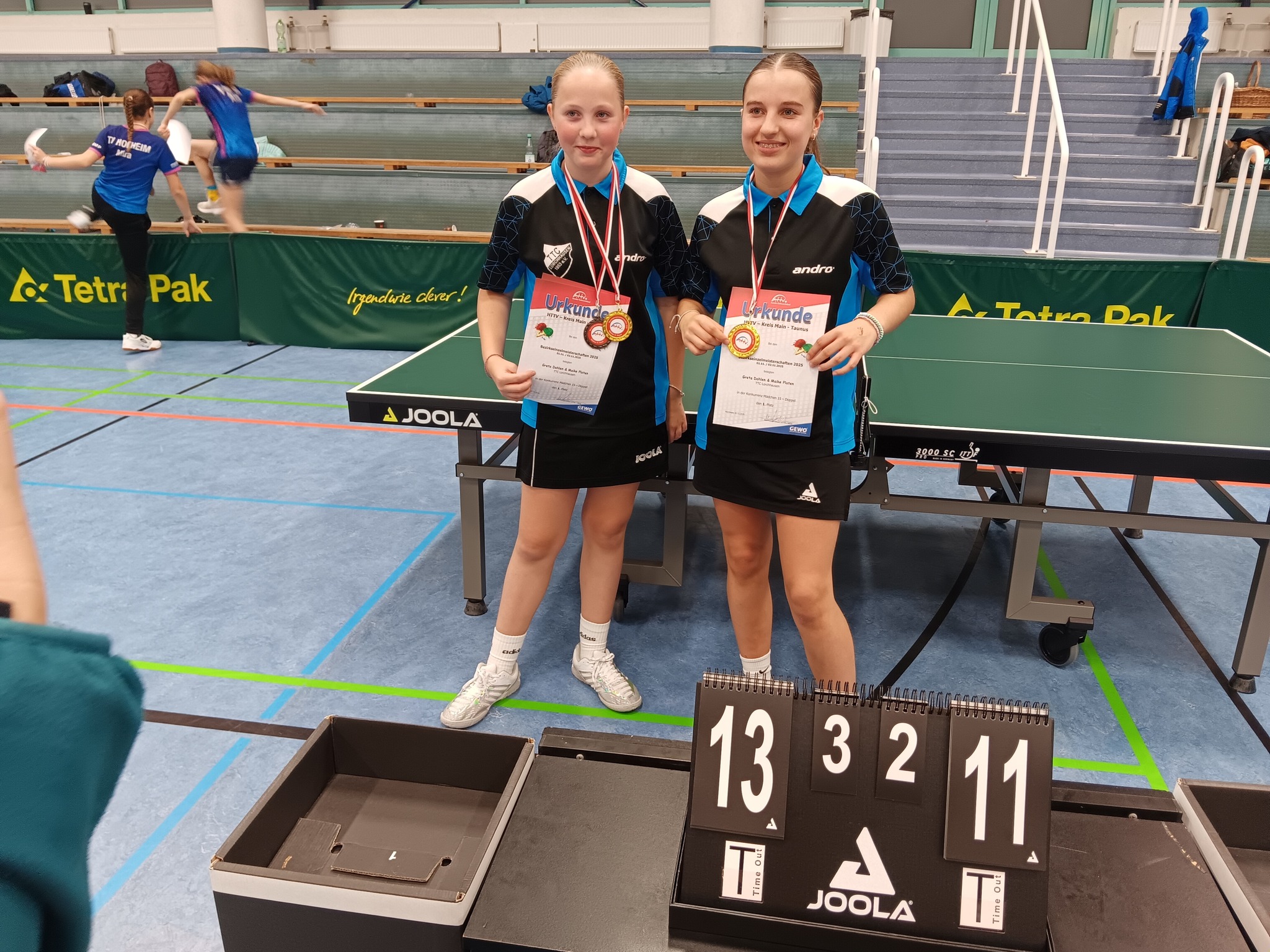 Direkt nach dem Einzelfinale stand das Endspiel im Doppel an. Gegnerinnen von Mina und Maria im Finale waren Fiona Chenxi Shi vom TV Niederrad und Johanna Stoll vom TTC Heppenheim. In einem unglaublich engen Match fiel die Entscheidung erst im fünften Satz. Mit 11:9 Punkten holten sich Maria und Mina den